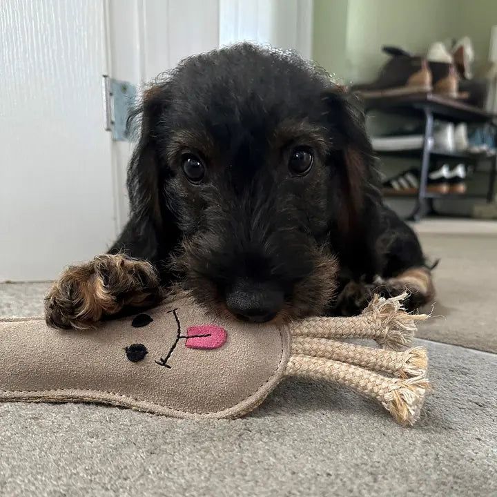 Lenny the Leek is a fun toy made from sustainable jute and covered in soft suede.