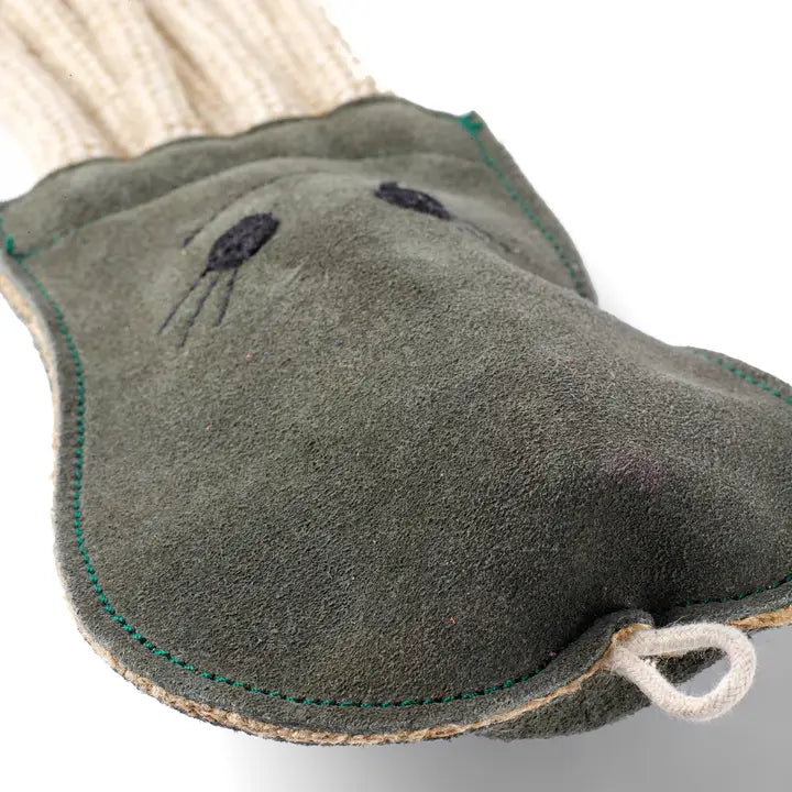 Made from sustainable jute which is a natural plant fibre and covered in a soft suede, it is robust and produced without using any added compound that would harm or be released when chewed. Jute is 100% biodegradable. The suede is a by-product and ensures this material is not wasted.